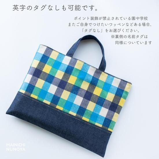 園や学校の指定で装飾不可の場合や、シンプル希望の場合、お子さんの好きなワッペンを付けたいなどの場合、英字タグなしをお選びください。