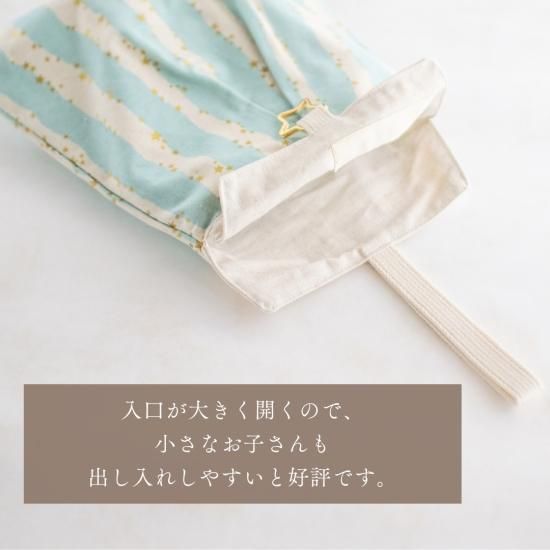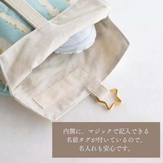☆シューズバッグ→星のDカンを使用しています。取り出し口が大きく開く作りなので、小さなお子さんでも入れやすいです。内側に名前タグがついています