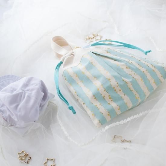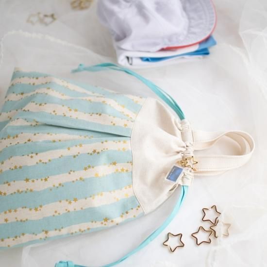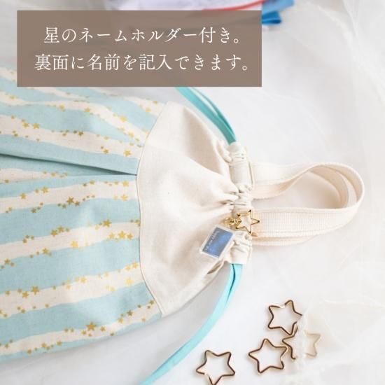 ☆着替え袋→星のネームホルダーがついていて、片側は天の川のプリントに「happy star 365」の文字、裏側は自分で名前を入れられるようになっています。(ご自身でマジックなどでご記入ください。名入れサービスはしておりません。)