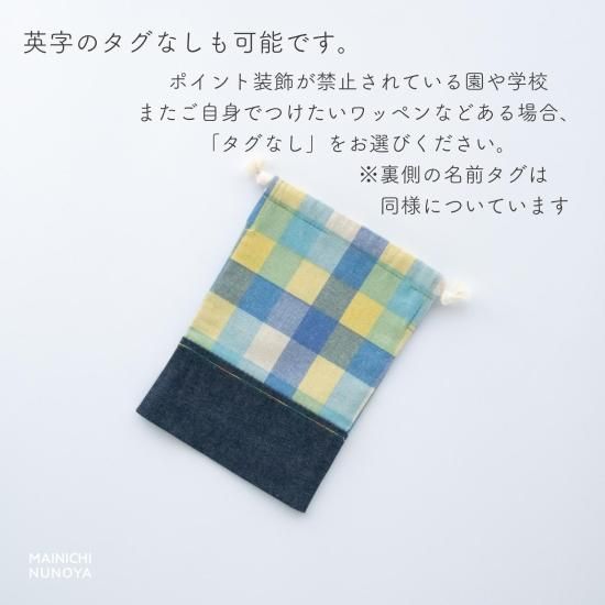園や学校の指定で装飾不可の場合や、シンプル希望の場合、お子さんの好きなワッペンを付けたいなどの場合、英字タグなしをお選びください。