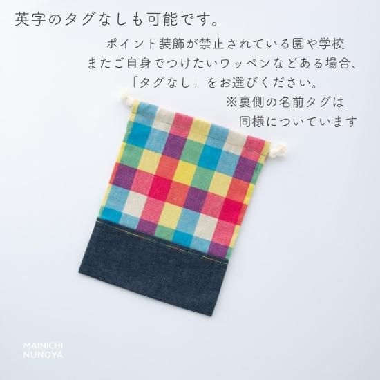 園や学校の指定で装飾不可の場合や、シンプル希望の場合、お子さんの好きなワッペンを付けたいなどの場合、英字タグなしをお選びください。