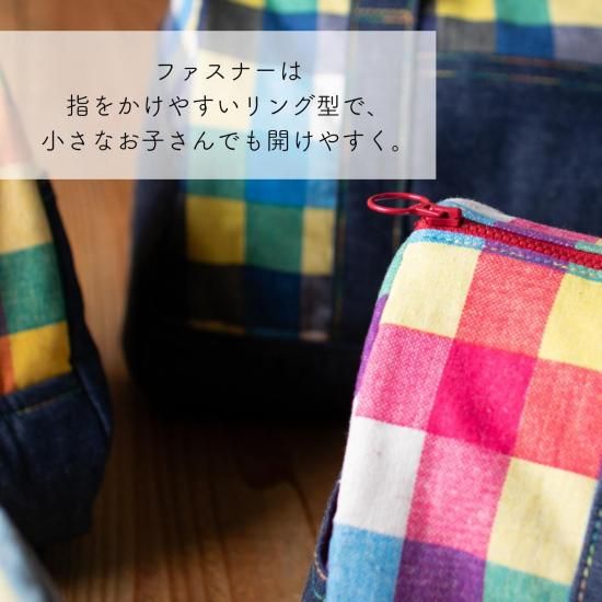 ・ファスナーはリングファスナー仕様で、小さなお子さんでも自分で開け閉めしやすいデザインです。