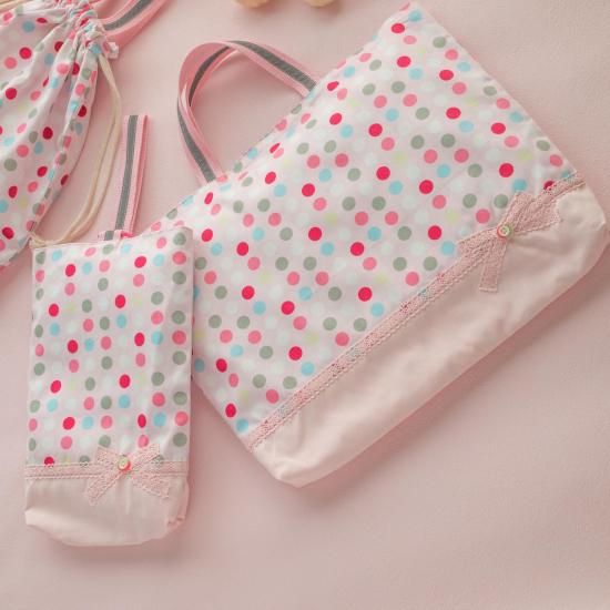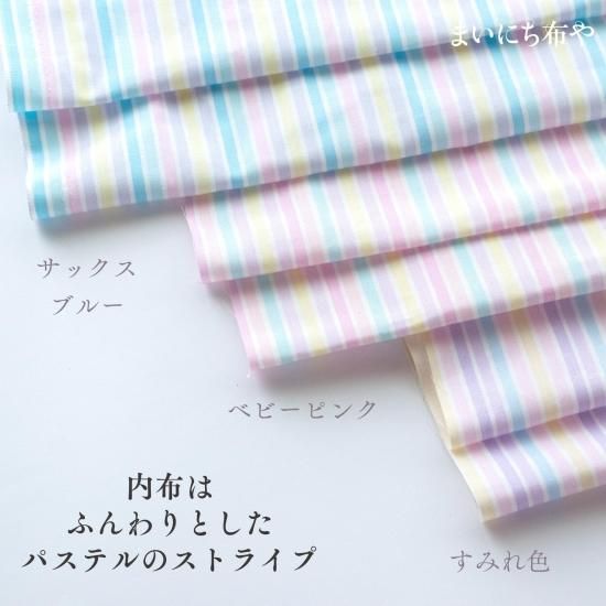 カラフルで可愛いドットと、落ち着いたレースのリボン。中をのぞくと、乙女パステルのストライプ生地。