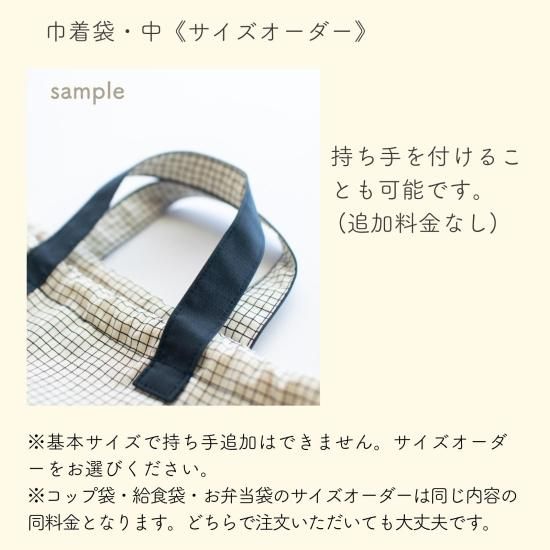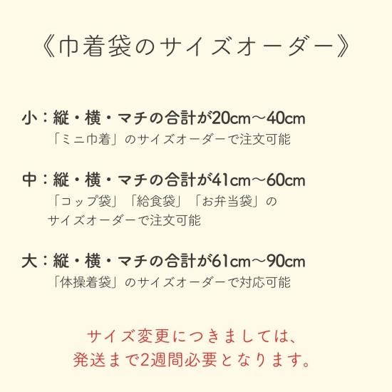 ※これ以外のサイズは、小さいものは【巾着小】・大きいものは【体操着袋】のオーダーサイズをご利用ください。