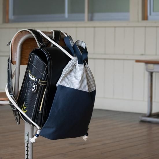 ナップサック型の体操着袋は、ランドセルの上からも背負えて便利。