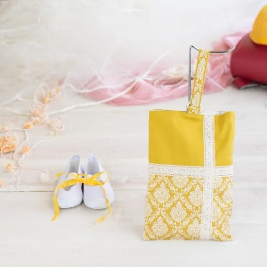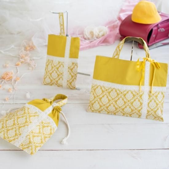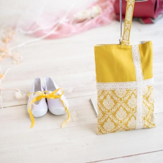 上品なダマスク柄の上履き入れ:くすみマスタード |サイズ変更対応
