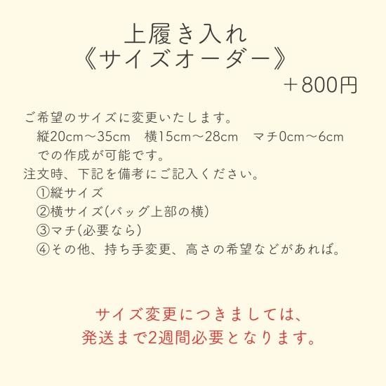 縦20cm~35cm 横15cm~28cm マチ0cm~6cmでの作成が可能です。