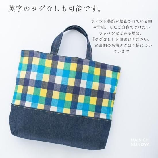 園や学校の指定で装飾不可の場合や、シンプル希望の場合、お子さんの好きなワッペンを付けたいなどの場合、英字タグなしをお選びください。