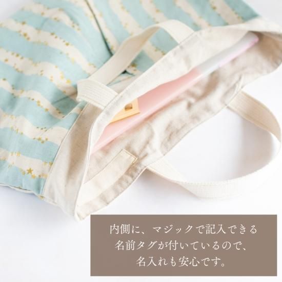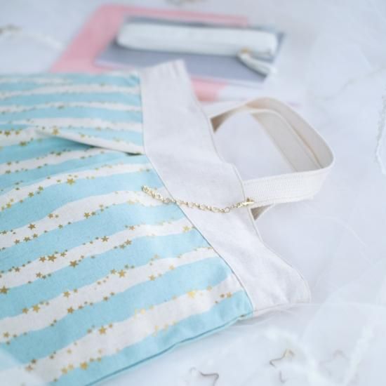 星のプリント、縫い糸、持ち手の飾り縫い、全てラメが入っているので、キラキラとかわいいです。