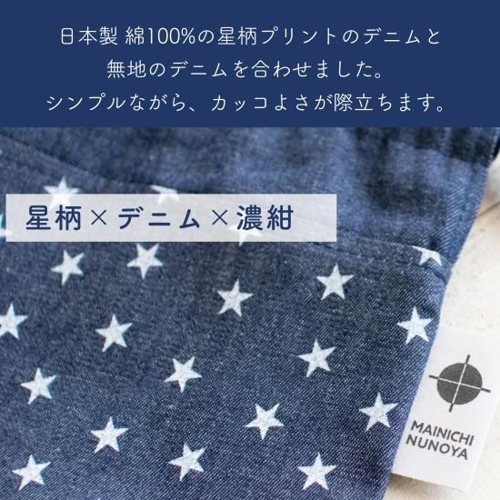 シンプルな星柄と、無地のデニムを合わせているので、どんなお子さんでも使いやすく、お孫さんや、お友だちや親せきのお子さんへの入園入学プレゼントにも最適です。