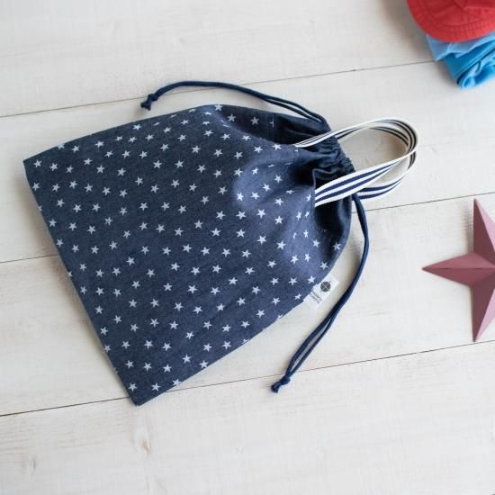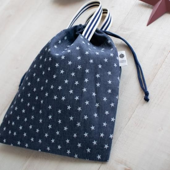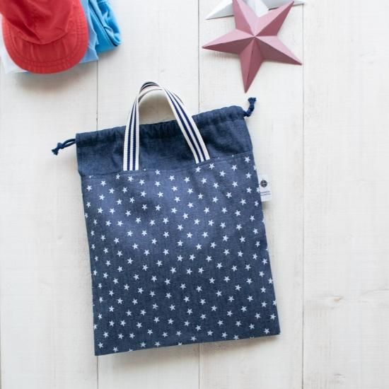 星のデニムと無地のデニム、濃紺のボーダーの持ち手を合わせ