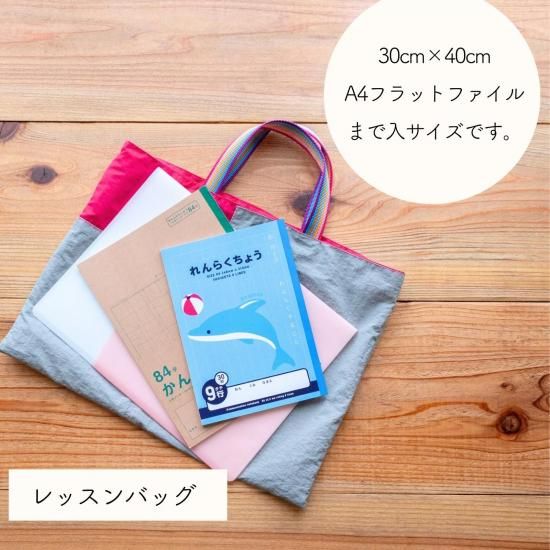 ・レッスンバッグ:縦30cm×横40cm。持ち手長さ28cm。